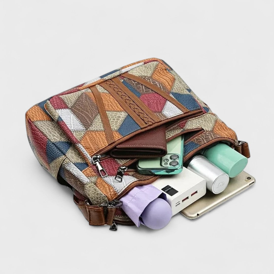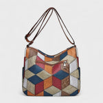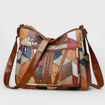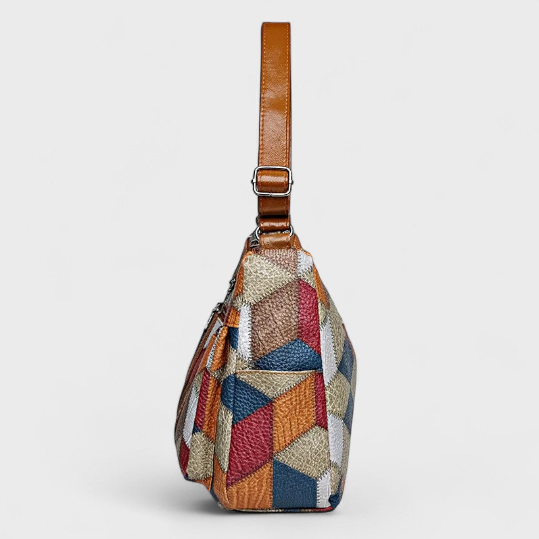 Se svým bohatým geometrickým patchworkem, elegantními koženými akcenty a prostornými kapsami, tato taška kombinuje rafinovaný styl a praktickou funkčnost, což umožňuje snadné uložení všech každodenních nezbytností.